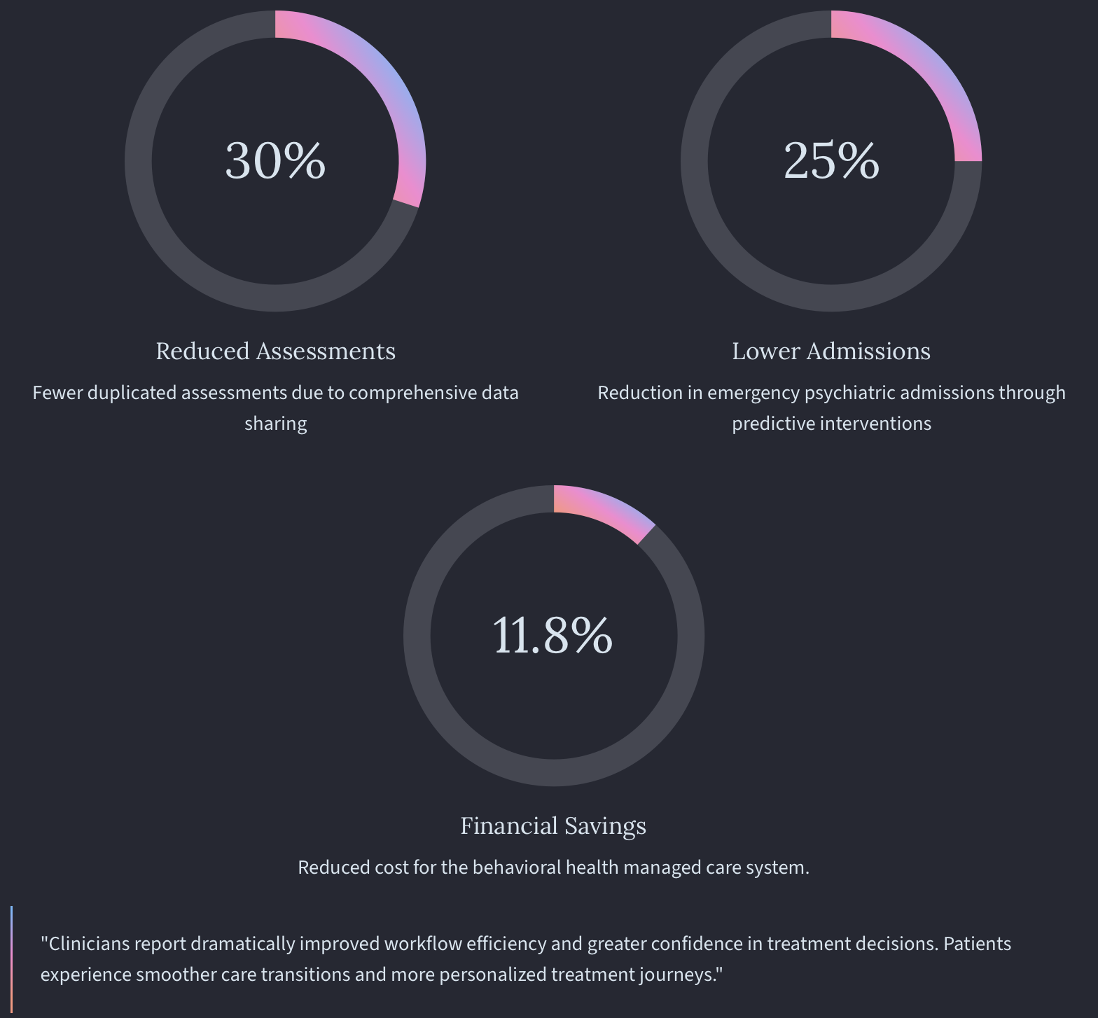 Our solution is a shared, algorithm-enabled EHR platform that unifies care delivery, forecasts patient needs, and schedules appointments, giving providers time with their patients and enabling informed decision-making. We link data from diverse platforms into standardized psychiatric treatment algorithms that enable machines to predict health outcomes and alert to future crises. The results: