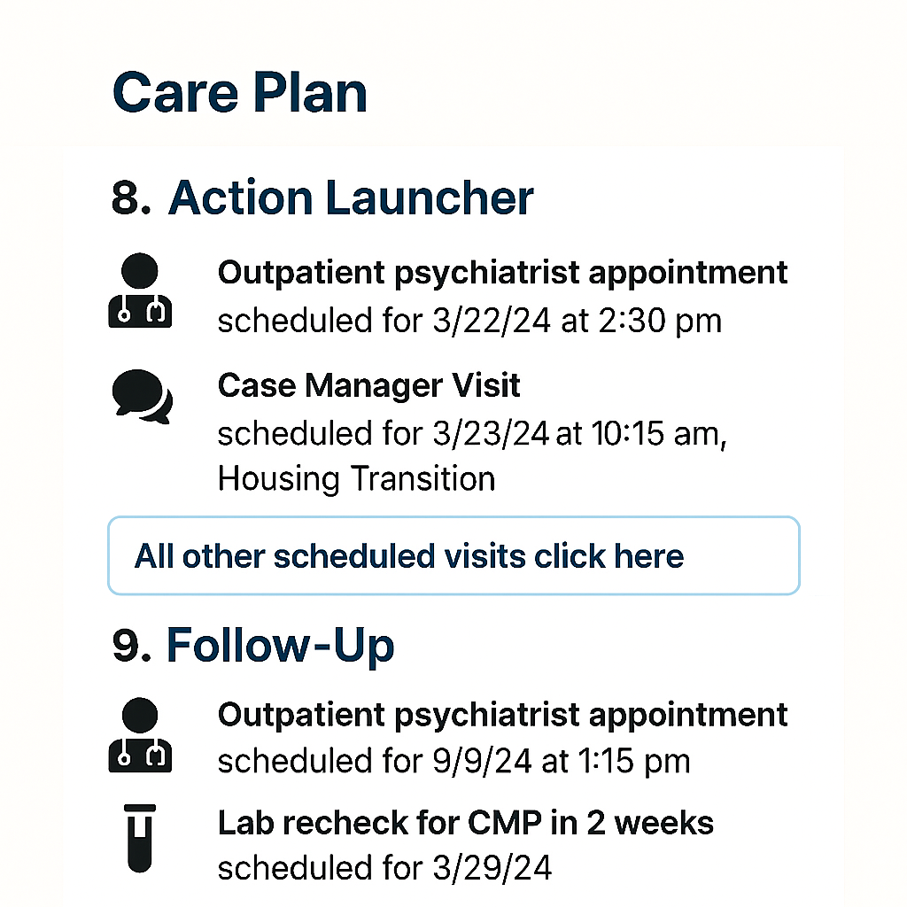 Our solution is a shared, algorithm-enabled EHR platform that unifies care delivery, forecasts patient needs, and schedules appointments, giving providers time with their patients and enabling informed decision-making. We link data from diverse platforms into standardized psychiatric treatment algorithms that enable machines to predict health outcomes and alert to future crises. The results: